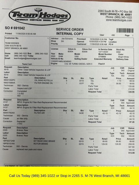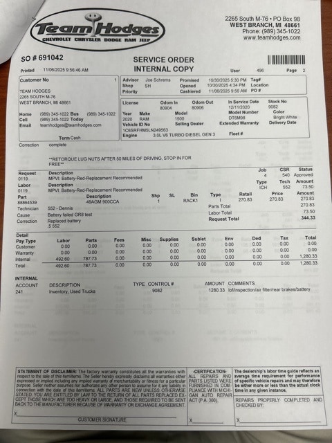 Inspection completed, oil and filter changed, engine air filter replaced, replaced rear brake pads and rotors, replaced battery, total reconditioning $1430.