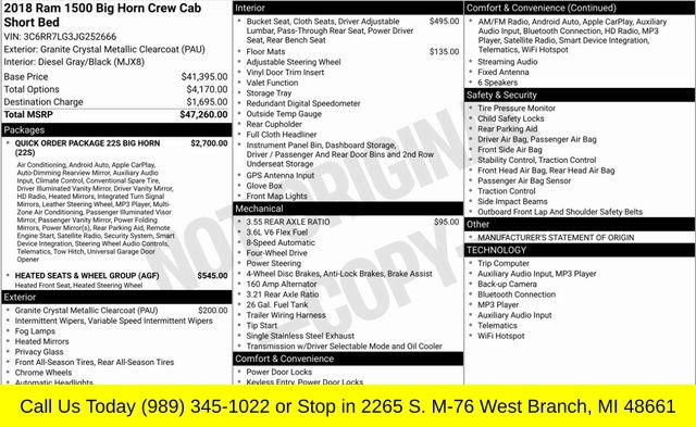 115V Auxiliary Power Outlet, 115V Auxiliary Rear Power Outlet, 2nd Row In Floor Storage Bins, 400W Inverter, Air Conditioning ATC w/Dual Zone Control, Auto-Dimming Exterior Driver Mirror, Auto-Dimming Rear-View Mirror, Big Horn Badge, Big Horn Level 2 Equipment Group, Black Premium Power Mirrors, Class IV Receiver Hitch, Cluster 7.0" TFT Color Display, Exterior Mirrors Courtesy Lamps, Exterior Mirrors w/Supplemental Signals, Foam Bottle Insert (Door Trim Panel), For More Info, Call 800-643-2112, Glove Box Lamp, Heated Front Seats, Heated Steering Wheel, Media Hub w/2 Charge Only USBs, ParkSense Front/Rear Park Assist w/Stop, Power 4-Way Driver Lumbar Adjust, Power 8-Way Driver Seat, Power Adjustable Pedals, Power-Folding Mirrors, Quick Order Package 25Z Big Horn, Rear Dome w/On/Off Switch Lamp, Rear Power Sliding Window, Rear Window Defroster, Security Alarm, SiriusXM Radio Service, Sun Visors w/Illuminated Vanity Mirrors, Universal Garage Door Opener.
