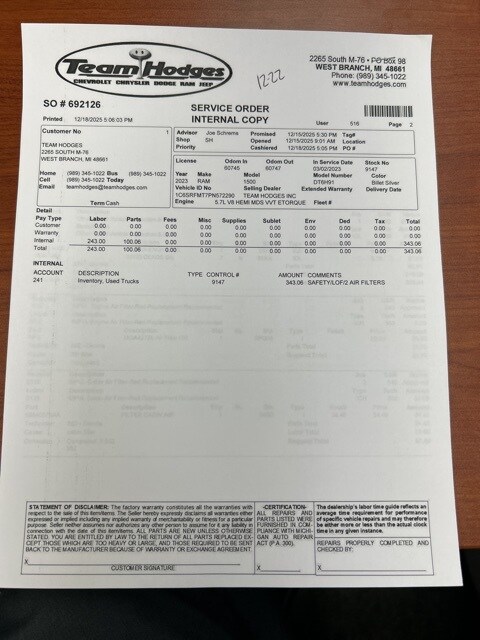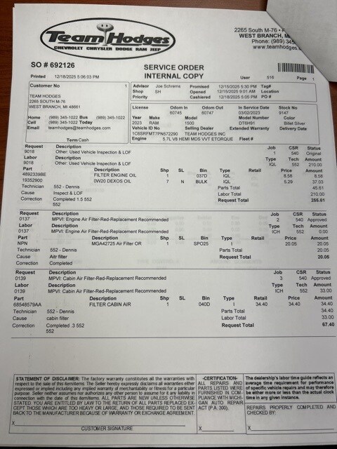 Inspection completed, oil and filter changed, Engine and cabin filter completed, total reconditioning $493.