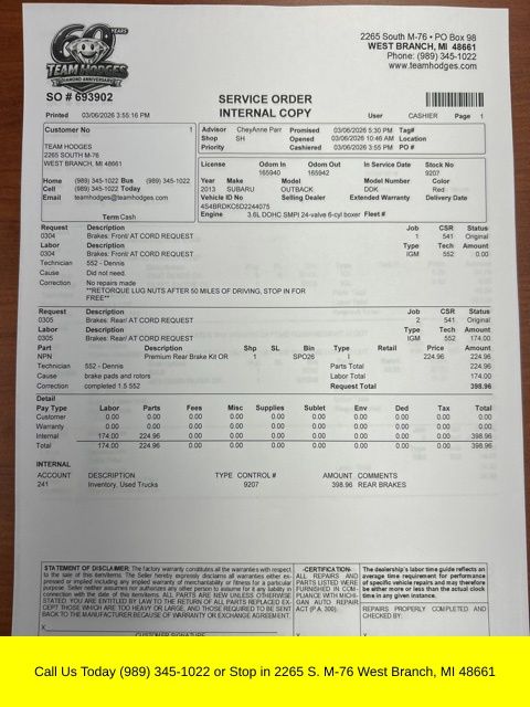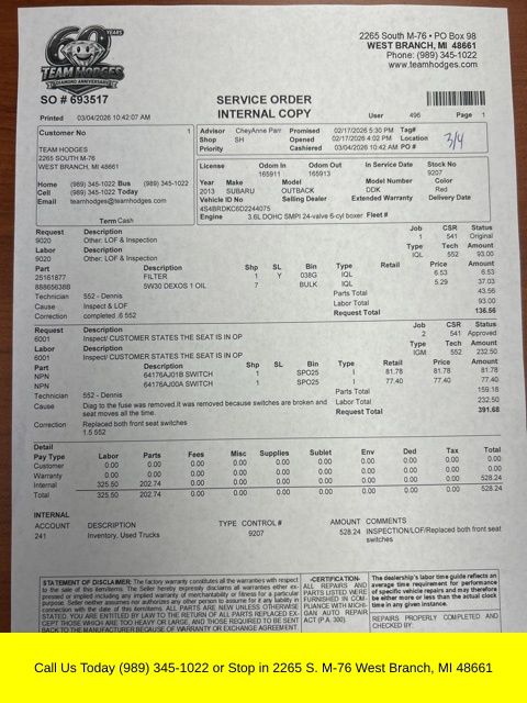 Inspection completed, oil and filter changed, replaced both front seat switches, replaced rear brake pads and rotors, total reconditioning $1,077.