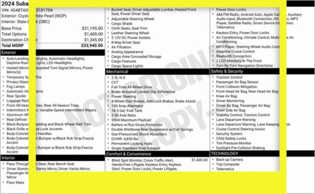 Crystal White Pearl 2024 Subaru Outback Premium AWD CVT Lineartronic 2.5L 4-Cylinder DOHC 16V **BLUETOOTH**, **REMOTE START**, Blind Spot Detection (BSD), BSD w/RCTA & Keyless Access & Push Button Start, Hands-Free Power Rear Gate, Keyless Access w/Push Button Start, Rear Cross Traffic Alert (RCTA).