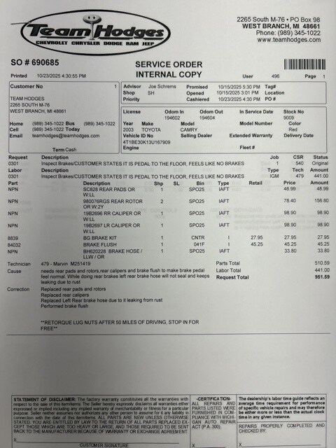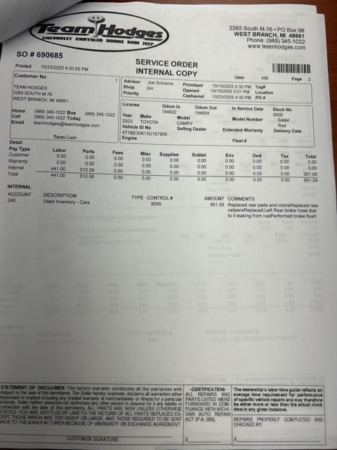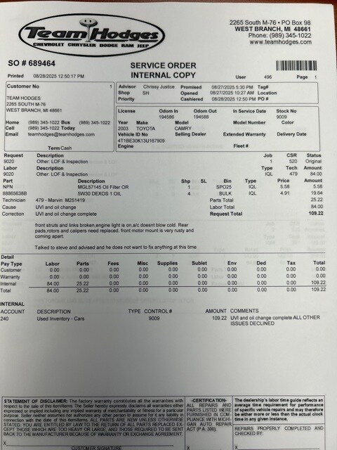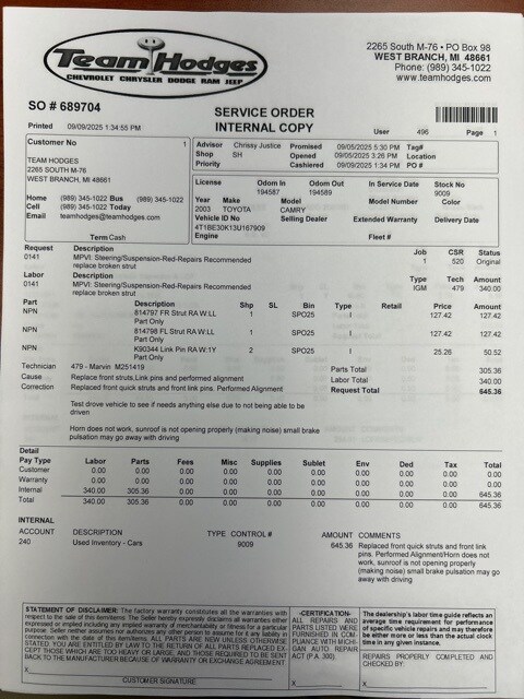 Inspection completed, oil and filter changed, replaced both front struts, link pins and alignment, replaced rear brake pads, rotors, calipers and brake hose, performed brake flush, total reconditioning $1,856.